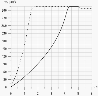Рис. 5 - Зависимость угловой частоты вращения ротора от времени: ––––– для номинального режима; – – – для пускового режима