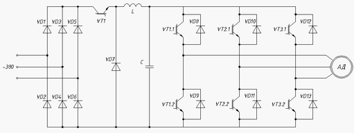 Трехфазное напряжение, подаваемое из сети, поступает на выпрямитель сформированный из диодов VD1 … VD6, в котором происходит выпрямление этого напряжения. За счет IGBT транзистора VT1 и диода VD7 имеется возможность ограничивать напряжение, подаваемое на автономный инвертор напряжения, собранный на IGBT транзисторах VT1.1 … VT3.2 и диодах VD8 … VD13.