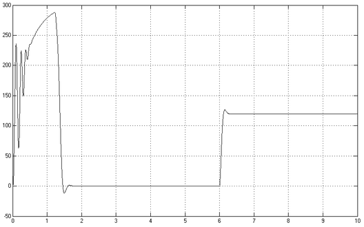 Моделирование прямого пуска спроектированного двигателя выполняется на холостом ходу с последующей нагрузкой после выхода на установившийся режим (через 5с) номинальным моментом (Mном=119,702 Н·м).