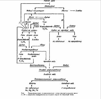 Как следует из рис., технология получения черновой меди характеризуется многостадийностью (за исключением варианта IV, предусматривающего непосредственную плавку концентратов на черновую медь).