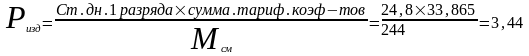 где: Ст дн 1 раз – дневная тарифная ставка 1 разряда; Ст час – часовая тарифная ставка 1 рабочего, сумма тарифных коэффициентов (графа 15), Qср – средний тарифный коэффициент; Мсм –выпуск в смену; ПТ – выработка на 1 рабочего в смену.