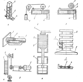 В магазинах второй группы перемещение изделий производится внешними силами. На рисунке 3.2.3, а показано устройство для перемещения изделий 1 по накопителю 3 к отделителю 5 за счет гравитационных сил, создаваемых дополнительным грузом 2. На рисунке 3.2.3, б перемещение изделий 3 в горизонтально расположенном накопителе 2 до упора в отделитель 4 осуществляется за счет гравитационных сил груза 1, передаваемых через систему шкивов. В конструкции, представленной на рисунке. 3.2.3, в, груз заменен пружиной 1, что позволяет сделать магазин более компактным.