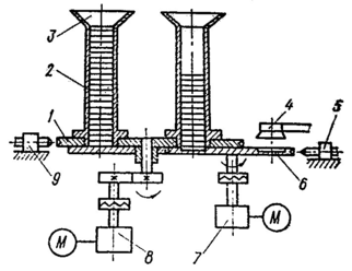 Установка изделий на позиции захвата производится механизмами поворота 7 и 8 и фиксаторами 5 и 9, обеспечивающими точную остановку основания 1 и отделителя 6 в заданном положении.