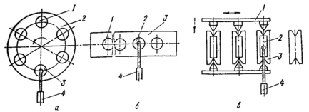 Накопители многопозиционных магазинов располагаются по линейной или круговой схеме. При круговой схеме (рис. 3.2.4, а) накопители 1 располагаются на платформе 2 по окружности. По мере забора изделий ПР 4, подвод очередного накопителя 1 на позицию захвата 3 осуществляется поворотом платформы 2 на угол: