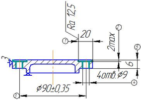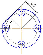Сверлить 4 отверстия, выдерживая размер 4,5 и 3. База – наружная цилиндрическая поверхность центрирующего пояска.