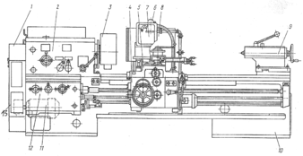 - коробку подач (поз.12), передающую движение от шпинделя к суппорту (поз.5) с необходимым передаточным числом с помощью ходового винта (поз.15), при нарезании резьбы или ходового вала (поз.14), при обработке других поверхностей;