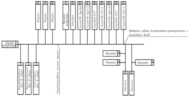 Все валы редуктора собираются отдельно, а затем устанавливаются в корпус. После сборки редуктор подвергают механическим испытаниям.