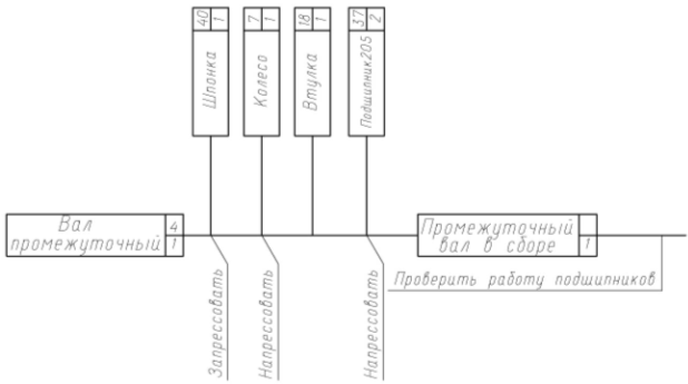 Вал-шестерня поз.3 фиксируется с помощью двух подшипников поз.36. Позиционирование зубчатого колеса поз.7 на промежуточном валу поз.4 осуществляется втулкой поз.18, фиксация его от поворота осуществляется призматической шпонкой поз.40. Так же колесо фиксируется прижатием её с одной стороны к буртику вала . Вал позиционируется на корпусе с помощью двух шариковых подшипников поз.37. Фиксируется прижатием внешнего кольца подшипника крышками поз.10 через втулки поз.17.