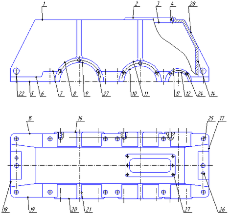 Конструкция крышки и ее закрепление на корпусе редуктора обеспечивает надежную работу механизма в целом, вследствие обеспечения точности зацепления цилиндрических передач, посредством установки и базирования крышки на корпус по поверхности № 5 и двум отверстиям под штифты поверхность № 26.