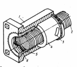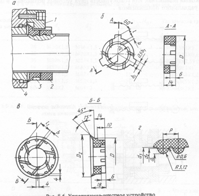 Резьбовые кольца из синтетического материала, жестко соединенные с гайкой, уплотняют шарико-винтовой механизм у противоположных ее торцов и хорошо очищают винт, однако эти свойства ухудшаются при износе колец. В устройстве, изображенном на рис. 4. 4 а), у каждого торца гайки помещено по два кольца (рис. 4. 4 б, в), изготовленных из фторопласта и имеющих на внутренней поверхности винтовой профиль (рис. 4. 4 г). Кольцо 3, называемое неподвижным, с помощью упора 1, входящего в имеющийся на нем паз, удерживается от поворота относительно гайки 4. Кольцо 2 увлекается вращающимся винтом передачи до тех пор, пока оно не войдет в контакт с неподвижным кольцом. Благодаря этому у торца гайки, где винт ввинчивается в нее, возникает контакт с натягом между винтовыми профилями колец и винта. При изменении направления его вращения такой же контакт возникает у противоположного торца гайки. Износ колец не влияет на качество работы устройства. Для отвода загрязнений в кольцах предусмотрены наклонные пазы.