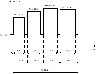 На данном этапе проектирования имеется возможность рассчитать и построить только упрощенную нагрузочную диаграмму – зависимость статических моментов в функции времени, т.е. без учета динамических нагрузок. Упрощенная нагрузочная диаграмма рабочей машины (механизма), построенная по рассчитанным для каждого участка цикла работы статическим нагрузкам, приведена на рисунке 4.