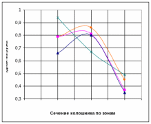 По данным таблицы 1.1 были построены графики изменения рудной нагрузки по сечению колошника, представленные на рисунке 1.2.