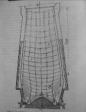 На рисунке 2.2 представлено поперечное сечение модели в масштабе 1: 4 с нанесенными последовательно очертаниями полоски и положениями жетонов при опускании их от колошника к выпускным отверстиям, траекториями движения жетонов, очертанием осевой зоны малоподвижных материалов и естественного конуса.