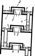 Тарельчатые колонны со сливными устройствами. В этих колоннах перелив жидкости с тарелки на тарелку осуществляется при помощи специальных устройств - сливных трубок, карманов и др. Нижние концы трубок погружены в стакан на нижерасположенных тарелках и образуют гидравлические затворы, исключающие возможность прохождения газа через сливное устройство.