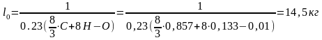 тип двигателя - четырехтактный, четырехцилиндровый, однорядный, однокамерный дизель. Номинальная мощность дизеля N=60кВт, номинальная частота вращения nн=2000об/мин; степень сжатия ε=16, коэффициент тактности τ=4; коэффициент избытка воздуха α=1,6.Дизельное топливо ,,Л,, (ГОСТ305-82); низшая удельная теплота сгорания топлива Qн=42500кДж/кг; средний элементный состав: С=85,7%, Н=13,3%, Q=1%. Расчет ведем для сгорания 1кг топлива. Теоретически необходимое количество воздуха для сгорания 1кг топлива:
