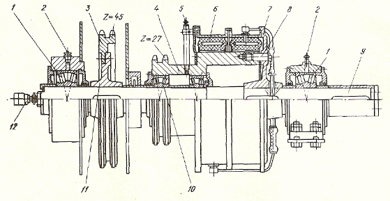 Планшайба 7 шинно-пневматической муфты 6 с помощью шпонки жестко закреплена на валу 9. Воздух в муфты подводится через вертлюжок 12 и отверстия в вале. В аварийных случаях для соединения муфты могут быть использованы болты 8. На вертлюжке 12 имеется цепная звездочка для привода тахогенератора, контролирующего частоту вращения стола ротора. Противоположная консоль вала 9 может быть использована для соединения с двигателем в случае индивидуального привода ротора. Подшипники смазываются через тавотницы 2 и 5.