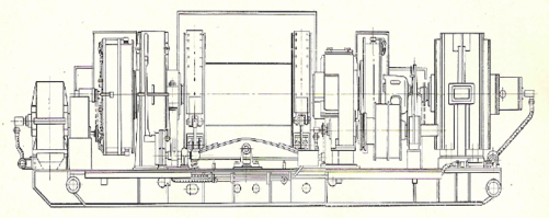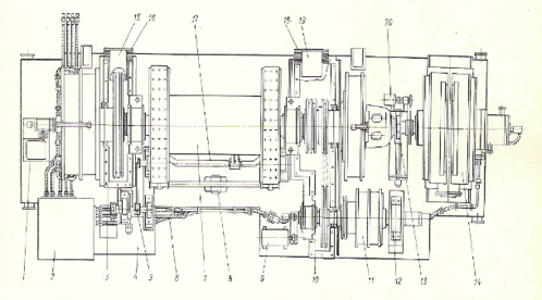 На рисунке 2.1 ([3], с. 174-175)показана буровая лебедка ЛБУ-1100, основные конструктивные элементы которой повторяются в других моделях современных отечественных и зарубежных лебедок для эксплуатационного к глубокого разведочного бурения. Лебедка монтируется на сварной металлической раме 4, приспособленной для ее перевозки и перемещения подъемным краном при монтажно-демонтажных работах. К раме приварены корпуса масляных ванн 3 и 10 цепных передач, соединяющих лебедку с коробкой перемены передач. В отцентрированных отверстиях корпусов масляных ванн установлен подъемный вал с барабаном 7 буровой лебедки.