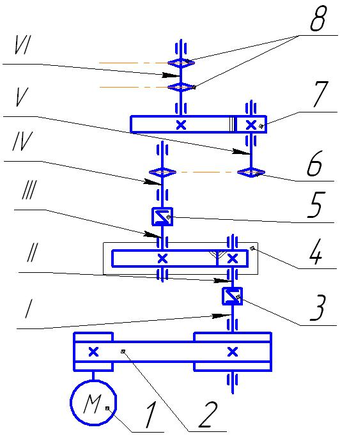 Вращение привода передается от электродвигателя 1 ведущим звездочкам цепного конвейера 8 посредством клиноременной передачи 2, муфт 3 и 5, косозубого одноступенчатого редуктора 4, цепной передачи 6 и зубчатой открытой прямозубой передачи 7. При этом на кинематической схеме римскими цифрами обозначены тихоходные (I, III, VI) и быстроходные (II, IV, V) валы соответствующих передач.