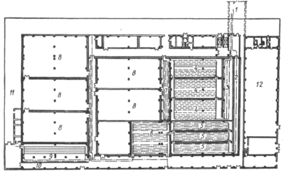 1 - переходная галлерея с туннелем предохлаждения (температура воздуха tВ =-20ºС, скорость движения 6 м/с ); 2 – туннель предохлаждения перед охлаждением; 3 - туннель предохлаждения перед замораживанием; 4 - камера замораживания; 5 - камера программированного охлаждения; 6 - камера хранения охлажденного мяса; 7 – разгрузочный коридор; 8 – камера хранения мороженого мяса; 9 – экспедиция; 10 – железнодорожная платформа; 11 - авторефрижераторная платформа; 12 – машинное отделение.