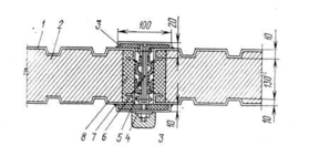 1 — профилированный лист из стали или алюминия (δал=3 мм); 2 — теплоизоляция (пенополиуретан); 3 —гнутый профиль из стали или алюминия; 4 — полиэтиленовый колпак на эпоксидной смоле; 5 — уплотняющий профиль из эластичного пенополиуретана; 6 — бакели-зированная фанера; 7 — герметизирующая мастика; 8 — участок теплоизоляции, пропитанный синтетическими смолами