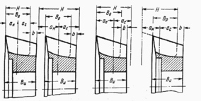 Если рассчитаная величина возможного утачивания долбяка н превышает максимально допустимую по технологическим возможностям шлифования высоту долбяка ви (определяется по таблицы 4, доп. 2), то как окончательную высоту долбяка принимается величина ви, выбранную из таблицы. В этом случае возможно несколько случаев расположения исходного пересечения долбяка.