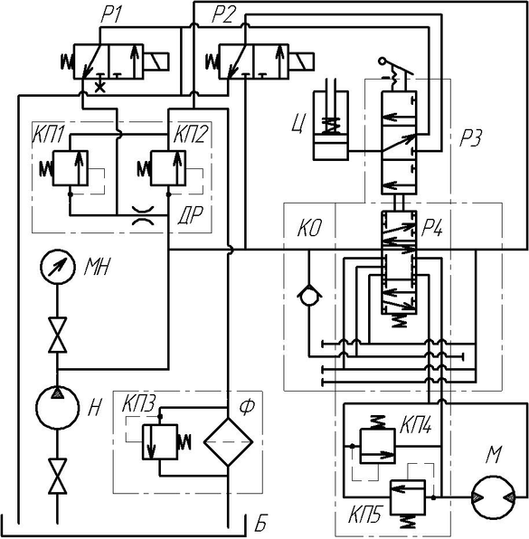 При подаче напряжения на электромагниты золотников Р1, Р2 они переключаются в рабочую позицию. В этом случае рабочая жидкость через гидрораспределитель Р4 поступает в сливную гидролинию и подается к дополнительным золотникам, а слив через предохранительный клапан КП2 становится возможным только при превышении давления его настройки.