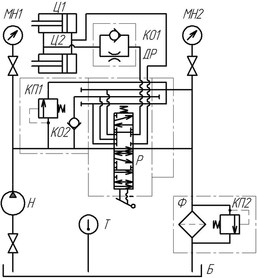 В схему входят: Б – гидробак, Т –термометр, Н – насос, Ф – фильтр, КП1 и КП2 – гидроклапаны предохранительные, КО1 и КО2 – гидроклапан обратный, МН1 и МН2 - манометры , Ц1 и Ц2 – гидроцилиндр, Р – гидрораспределитель, ДР – гидродроссель .