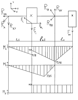 Rby = [ Fr1*lб/2 + Fa1 d1/2 + +Fon*( Lоп+ lб)] / lб =