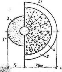 который можно уподобить элементарной поре глиняной гранулы. Во время нагрева при достижении определенной температуры глиняная оболочка рассматриваемого шарика начнет размягчаться, спекаться и в конечном счете уплотнится и станет газонепроницаемой, находясь в пиропластическом состоянии. Если в этот момент внутри шарика по каким-либо причинам начнут выделяться газы, то, не имея выхода через оболочку, они будут создавать во внутренней полости шарика избыточное давление, под воздействием которого оболочка будучи размягченной, начнет расширяться и радиус ее станет rвсп. Это и будет представлять собой вспучивание элементарной ячейки глины.