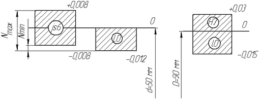 2.5 По ГОСТ 520 – 89 и ГОСТ 25347 – 82 определяем отклонения ES, EI, ei, es, строим поля допусков по наружному (D) и внутреннему (d) диаметрам и определяем табличные натяги Nmax и Nmin