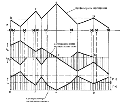 Движение начинаем от точки А. Линии объемов потенциального стоков Vп для точек, расположенных справа от нее, повторяют профиль трассы нефтепровода. Отличие заключается в том, что линия Vп левее точки А повторяет профиль трубопровода, а линия Vл правее точки А является как бы его зеркальным отражением.