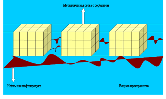 Схема использования металлической сетки с сорбентом на водной поверхности приведена на рисунке 3.