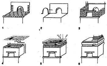 Толщина стенок печной головы (кожуха) - полкирпича, ширина самого кожуха обычно равняется двум кирпичам. По центру в кладке оставляют проем, через который будет осуществляться доступ к устью топки. На определенном уровне - чуть ниже арки устья топки, чтобы во время топки дым не выбрасывало в помещение - этот проем перекрывают перемычкой - деревянным прочным бруском (3). В верхних углах проема под ней желательно (для улучшения тяги) положить тесаные на угол кирпичи. На уровне верхней кромки сбитой части печи горизонтально крепят к двум стойкам опечек металлическую кованую полосу сечением 30х5 мм. Она будет нужна, чтобы начать укладывать на нее с этого уровня кирпичи перекрытия дымохода кожуха и чтобы предотвратить проминание глины под ними (4). Можно для облегчения кладки перекрытия просто перекрывать проем кирпичом, выдвигая каждый следующий ряд на половину кирпича. Значит, достаточно двух рядов, чтобы перекрыть внутреннее пространство шириной в полтора кирпича. С одной стороны надо оставить отверстие для дымохода размером в один кирпич. Сверху над перекрытием (5) на высоту в два кирпича кладка ведется по периметру. Внутри нее на этом уровне проходит канал дымохода, и с правой стороны, где канал поворачивают вверх, направляя в дымовую трубу, устанавливают задвижку. Над каналом дымохода делают еще одно перекрытие - выкладывают три ряда кирпича и разделку (противопожарное расширение) трубы в перекрытии дома, завершая тем самым очередной этап работ по печи (6).