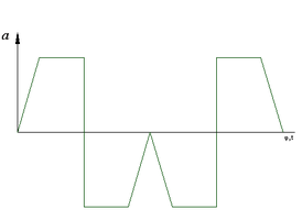 По заданному графику ускорения толкателя а = f (t), графическим интегрированием по методу хорд получаю графики скорости и перемещения толкателя.