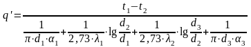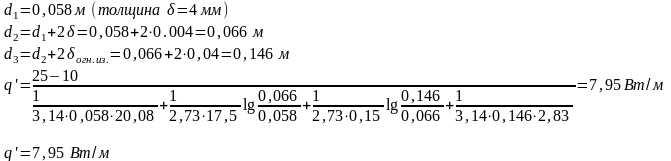 -коэффициент теплоотдачи от наружной поверхности изоляции к окружающей среде; d1- внутренний диаметр; d2- наружный диаметр трубы; d3- диаметр трубы с изоляцией; t1- температура воздуха t1=250С; t2-температура наружного воздуха t2=100С.