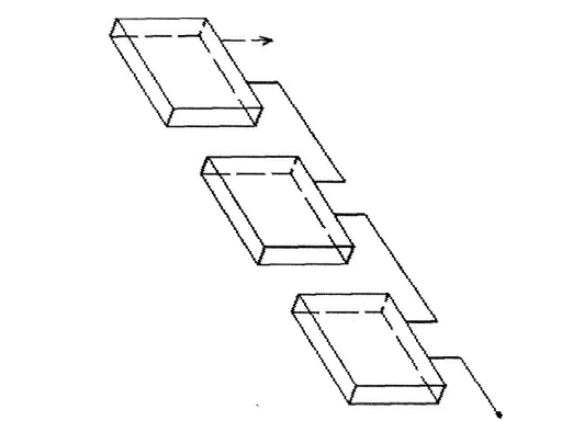 Причем первая дает хорошие результаты при 2320 • если где , для меди для стали Тогда потери напора на трение будут рассчитываться по формуле Дарси-Вейсбаха: В свою очередь местные потери напора в местах локальных возмущений потока рассчитываются по формуле: где Зная полное сопротивление кессона можно приступить к расчету сопротивления на первом уровне. Для второго и третьего уровня кессонов сопротивление вычисляются аналогичным образом. Переходим к расчету общего сопротивления магистрали. Для этого необходимо суммировать три параллельных соединения трубопроводов. Первым находим сопротивление при параллельном соединении участка ВБА и второго уровня кессонов, оно будет равно сопротивлению в точке В. Вторым находится сумма сопротивлений в точке В на участке ЕВ, с третьим уровнем кессонов: Таким образом, мы находим сопротивление в точке К, что будет являтся общим сопротивлением всей системы. Оно находится суммированием сопротивлений в точке Е и на участке КЕ: Потери напора в системе можно легко найти произведением общего сопротивления системы на общий расход. В нашем случае, исходя из всего вышесказанного, эта формула будет выглядеть так: Запишем уравнение сети в общем виде: В нашем случае приращения пьезометрического и динамического напоров не требуются и равны нулю. Поэтому перепишем уравнение (2.28) для нашего случая: Численный расчет Для того чтобы определить расход жидкости на один кессон необходимо знать площадь поперечного сечения и диаметр трубы кессона. Диаметр трубы и размеры кессона приняты по справочной литературе. Зная расход кессона определяем расчетный расход на участках магистрали БВ, ВЕ, ЕК: где последовательно (см. рис. 4.1.) Рис. 3. Три уровня кессонов. Теперь необходимо рассчитать диаметры участков магистрали по найденным расходам: По ГОСТу 3262-62 (трубы медные) ближайший внутренний диаметр будет равен: скорость воды на участке магистрали БВ будет равна: По ГОСТу 3262-62 (трубы медные) ближайший внутренний диаметр будет равен: скорость воды на участке магистрали равна: EB будет равна: По ГОСТу 3262-62 (трубы медные) ближайший внутренний диаметр будет равен: скорость воды на участке магистрали равна: КE будет равна: Сопротивление кессона равно: Длина трубы кессона равна: Определим режим движения воды в кессоне: Толщина ламинарного слоя: Коэффициент эквивалентной шероховатости для труб кессонов возьмем из справочника для бесшовных стальных новых и чистых труб. Он равен 0,02 мм. Видно, что толщина ламинарного слоя больше, чем выступы шероховатости, следовательно, вода в кессонах движется в гидравлически гладком режиме (чего можно добиться, проводя регулярную чистку и своевременную замену кессонов, которые являются одной из наиболее ответственных составляющих конструкции печи). Коэффициент трения в трубе кессона: Теперь найдем удельные сопротивления трения и местное сопротивление для кессона: Суммарные местные сопротивления в кессоне: И, наконец, сопротивление кессона: Рассчитаем потери, длину и сопротивление на первом уровне: где где Так как скорость, диаметры труб, длина кессона, материал из которого сделаны трубы одинаково что на первом, что на втором уровне, следовательно: Рассчитаем сопротивление на участке ВБА. Для этого аппроксимируем сопротивление первого уровня и участка ВБ: Найдем режим движения жидкост