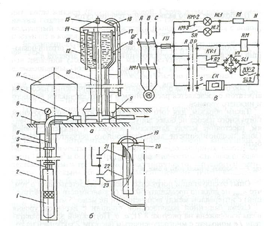 Рис. 1.2. Башенная водонасосная установка с погружным электродвигателем (а), схема датчика уровня воды (б) и принципиальная электрическая схема управления (в):