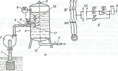 Рис.1.1. Технологическая схема водоподъемной установки типа ВУ (а) и принципиальная электрическая схема управления ею (б):