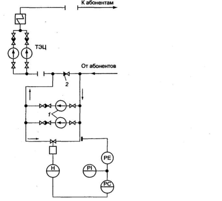 При автоматизации насосной подстанции на обратной магистрали (рис. 2.3) дополнительно предусматривается поддержание постоянного давления во всасывающем коллекторе, поскольку колебания давления существенно влияют на надежность работы отопительных систем. Автоматическая защита от понижения давления во всасывающем коллекторе перекачивающей подстанции действует при аварийных ситуациях. В этом случае автомат рассечки разделяет тепловую сеть на две гидравлически независимые зоны: верхнюю (с высокой отметкой пьезометра после срабатывания защиты) и нижнюю (с низкой отметкой пьезометра).