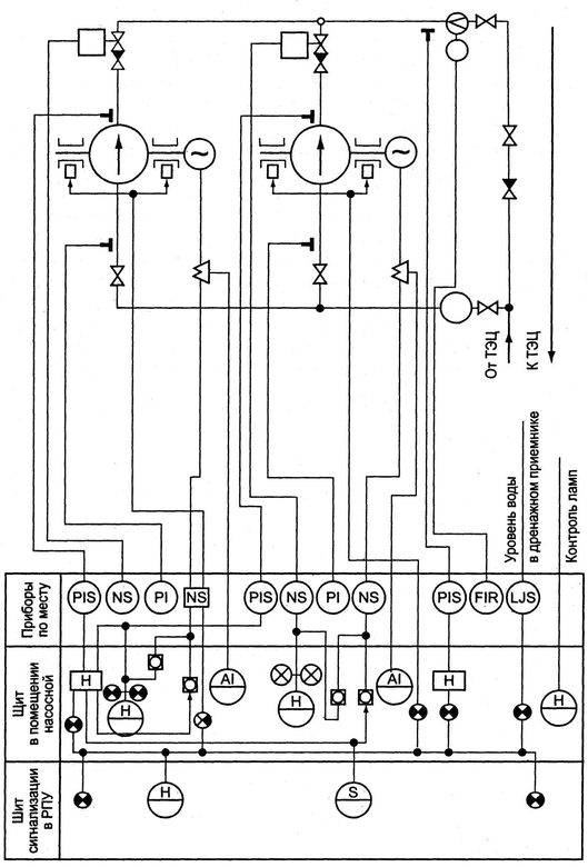 Более сложны схемы автоматизации насосных подстанций, основное назначение которых состоит в изменении давления в подающем или обратном трубопроводе за подстанцией, а также в увеличении пропускной способности тепловой сети. Автоматизация насосных подстанций на подающей магистрали (рис. 2.2) включает решение задач: блокировки насосных агрегатов, электродвигателей насоса и задвижки на напорном патрубке насоса; автоматического включения резервного насоса при падении давления в напорном патрубке работающего и автоматического переключателя на резервный источник электропитания; сигнализации о неисправностях работы насосной подстанции (превышении допустимой температуры в подшипниках насосов, автоматическом включении резервного насоса, понижении давления воды за насосами и др.).