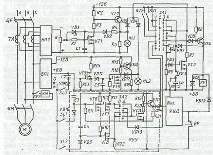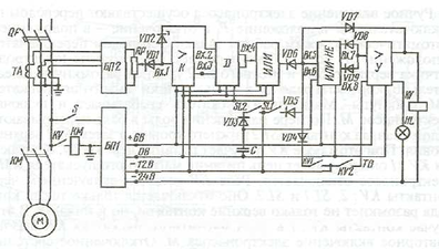 Бесконтактное реле Т-202, логические элементы D, ИЛИ и блок питания БП2 защищают двигатель от перегрузок и от работы в аварийных режимах. Датчиком тока является трансформатор тока ТА, выпрямленный ток от которого поступает на потенциометр RP. Движком потенциометра RP устанавливают значение токов срабатывания защиты при перегрузках и коротких замыканиях электродвигателя. При токах перегрузки срабатывает бесконтактное реле Т-202, с которого поступает на вход Вх.3 сигнал, вызывающий срабатывание элемента выдержки времени D. С элемента D сигнал с выдержкой времени через элемент ИЛИ поступает на вход Вх.5 элемента ИЛИ— НЕ, что вызывает отключение реле KV и электронасоса М. При токах короткого замыкания напряжение на потенциометре RP возрастает в несколько раз. Вследствие этого открывается стабилитрон VD2 и через вход Вх.2 на элемент D поступает сигнал, минуя цепочку выдержки времени в элементе D. С элемента D сигнал последовательно поступает на входы Вх.4 и Вх.5 и исчезает на выходе Вх.7, что вызывает отключение электронасоса без выдержки времени.