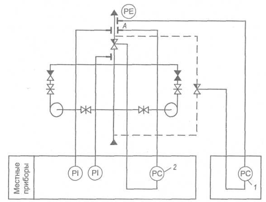 Предположим, что при внезапной остановке рабочего насоса давление теплоносителя на линии нагнетания резко падает. Эта зависимость и положена в основу работы схемы автоматизации, обеспечивающей включение резервного насоса при аварийной остановке рабочего.