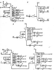 Рис. 1. Принципові схеми установок первинної перегонки нафти: AT (а), ВТ паливна (б), ВТ масляна (в), АВТ паливно-масляна (г):