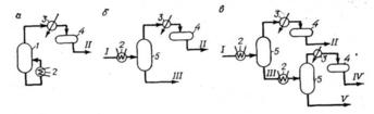 Рис. 2. Схеми простої перегонки: а - поступова; б - однократна; в - дворазова; 1 - куб; 2 - кип'ятильник; 3 - конденсатор; 4 - приймач; 5 - сепаратор; І - сировина; ІІ - відгін; ІІІ - залишок; ІV - відгін другої ступіні; V - залишок другої ступіні.