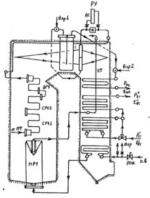 В ПК вода с помощью питательного насоса подается в экономайзер, откуда поступает в панели, расположенные в топке. В выходной части панелей вода превращается в пар и начинается перегрев воды. В ПК отсутствует барабан и опускные трубы, что снижает удельный расход металла, т.е. удешевляет конструкцию котла. Существенный недостаток ПК заключается в том, что, попадающие в котел с питательной водой соли, либо отлагаются на стенках змеевиков, либо вместе с паром поступают в паровые турбины, где оседают на лопатках рабочего колеса, и снижают КПД турбины. Поэтому к качеству питательной воды для ПК предъявляются повышенные требования. Другой недостаток – увеличенный расход энергии на привод питательного насоса.