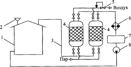 Рисунок 8 - Адсорбционная система УЛФ: 1 —резервуар с бензином; 2—дыхательный клапан; 3 — газовая обвязка; 4 — адсорбер; 5—регулятор давления типа «до себя»; 6 — холодильник; 7—конденсатосборник; 8—насос для откачки конденсата