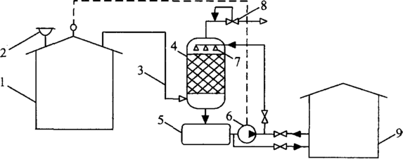 Наряду с адсорбционными получили распространение и абсорбционные системы УЛФ. Их принципиальная схема приведена на рис. 9. Она включает резервуар с бензином 1, снабженный дыхательным клапаном 2, который посредством газовой обвязки 3 связан с абсорбером 4. При повышении давления в ГП резервуара паровоздушная смесь поступает в нижнюю часть абсорбера и движется вверх по каналам, образованным в нем специальными насадками (кольца Ришига и т. п.). Навстречу ПВС, сверху вниз, движется абсорбент— низколетучий поглотитель (керосин, дизельное топливо и т. п.). Для этого абсорбент из емкости 5 забирается насосом 6 и распыляется через форсунки 7. На поверхности насадок образуется тонкая пленка абсорбента, которая поглощает углеводороды из ПВС. В абсорбере поддерживается противодавление с помощью регулятора давления 8 типа «до себя». Отработанный (насыщенный) абсорбент периодически сбрасывается в емкость 9 и проходит регенерацию (на рисунке не показана).