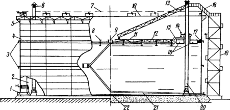 Рисунок 6 - Резервуар с плавающей крышей: 1 —приемо-раздаточный патрубок с хлопушкой; 2—запасной трос хлопушки; 3—кольца жесткости; 4—стенка резервуара; 5—кольцевая площадка жесткости; 6—огневой предохранитель; 7—трубопровод раствора пены; 8—опорные стойки плавающей крыши; 9—водоприемник атмосферных осадков; 10—сухопровод орошения стенки резервуара; 11—плавающая крыша; 12 — опорная ферма; 13—катучая лестница; 14 — бортик удерживания пены; 15 — опорная ферма; 16—периферийный кольцевой понтон плавающей крыши; 17—уплотнитель (затвор) плавающей крыши; 18—переходная площадка; 19—шахтная лестница; 20—трубчатая направляющая плавающей крыши; 21—дренажная система; 22—днище резервуара