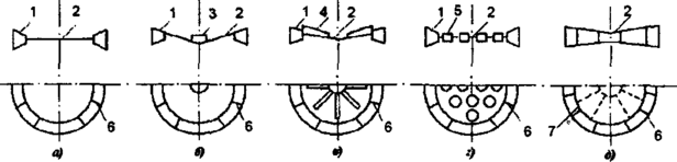 Рисунок 7 - Основные типы применяемых плавающих крыш: а)—однодечная; б) однодечная с центральным поплавком; в—однодечная с ребрами жесткости; г—однодечная с поплавками; д—двудечная; 1 —закрытый кольцевой короб; 2—листовой настил; 3—центральный поплавок; 4—ребра жесткости; 5—поплавок; 6—радиальная переборка; 7—кольцевая переборка
