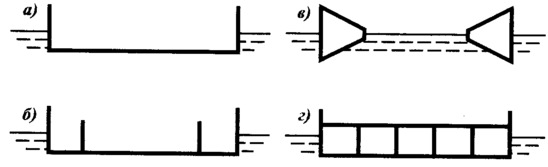 Рисунок 5 - Основные типы металлических понтонов: а—чашеобразный однодечный; б—однодечный с периферийным открытым коробом, разделенным на отсеки; в—однодечный с периферийным закрытым коробом, разделенным на отсеки; г—двудечный, разделенный на отсеки